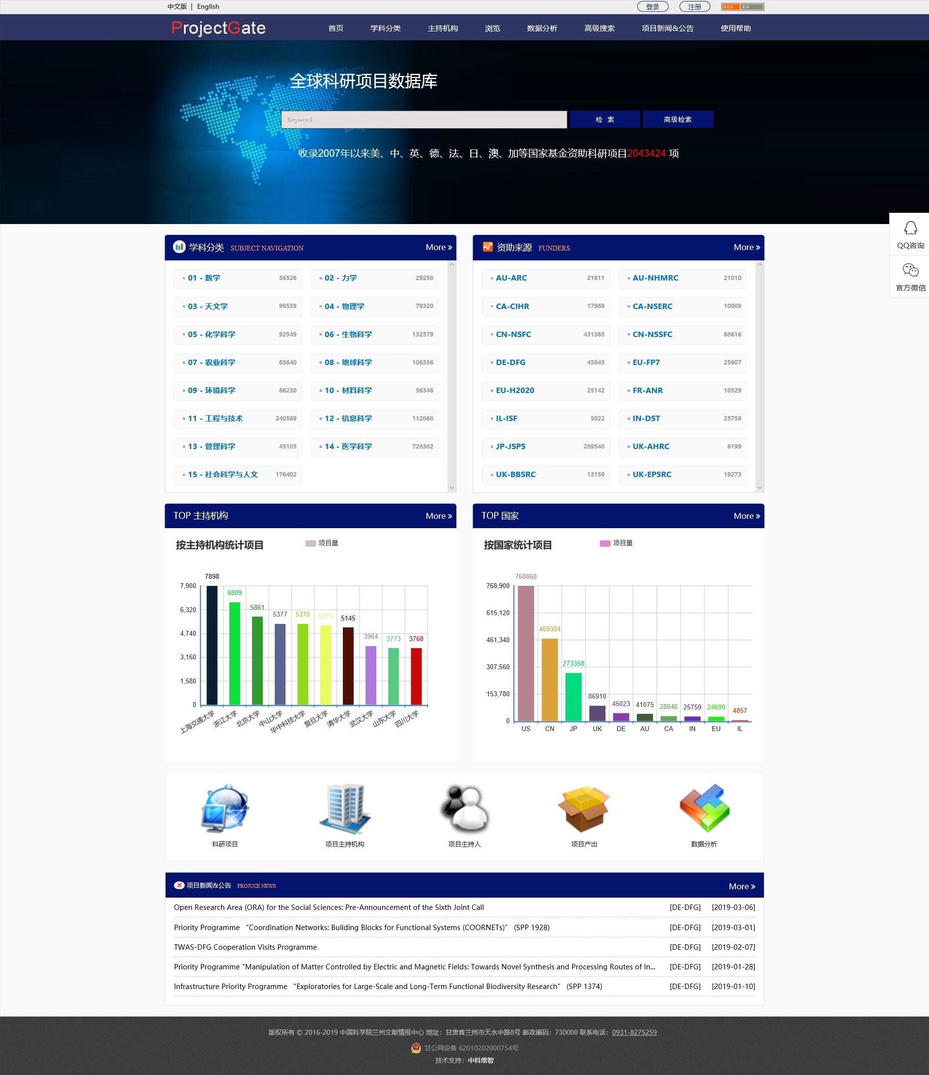 “全球科研項目數(shù)據(jù)庫(ProjectGate)”于2017年由中國科學(xué)院蘭州文獻情報中心建設(shè)完成。科研項目信息可以完整清晰地反映一個國家的科技部署、科研實力以及研究重點的變化、科技創(chuàng)新的軌跡,為科研用戶項目申報、分析本領(lǐng)域研究熱點、研究選題、尋找合作機構(gòu)和合作者等提供重要的信息支持。全球科研項目數(shù)據(jù)庫的建設(shè)為科研人員集成方便的發(fā)現(xiàn)全球主要發(fā)達國家科研項目信息提供了重要的信息保障。