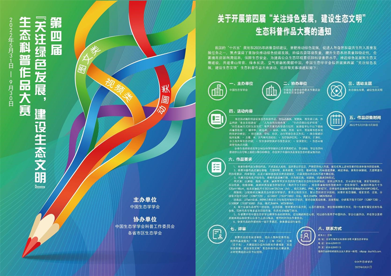 我國(guó)的“十四五”規(guī)劃和2035年遠(yuǎn)景目標(biāo)建議,要把推動(dòng)綠色發(fā)展,促進(jìn)人與自然和諧共生列入重要發(fā)展任務(wù)之一,重點(diǎn)強(qiáng)調(diào)了要加快推動(dòng)綠色低碳發(fā)展,持續(xù)改善環(huán)境質(zhì)量,提升生態(tài)系統(tǒng)質(zhì)量和穩(wěn)定性,全面提高資源利用效率,保障生態(tài)安全。為提高公眾生態(tài)環(huán)境意識(shí)和科學(xué)素養(yǎng)水平,推進(jìn)綠色發(fā)展和生態(tài)文明建設(shè),共建青山常在、綠水長(zhǎng)流、空氣常新的美麗中國(guó),中國(guó)生態(tài)學(xué)學(xué)會(huì)擬開(kāi)展第四屆“關(guān)注綠色發(fā)展,建設(shè)生態(tài)文明”生態(tài)科普作品大賽活動(dòng)。現(xiàn)將有關(guān)事項(xiàng)通知如下: