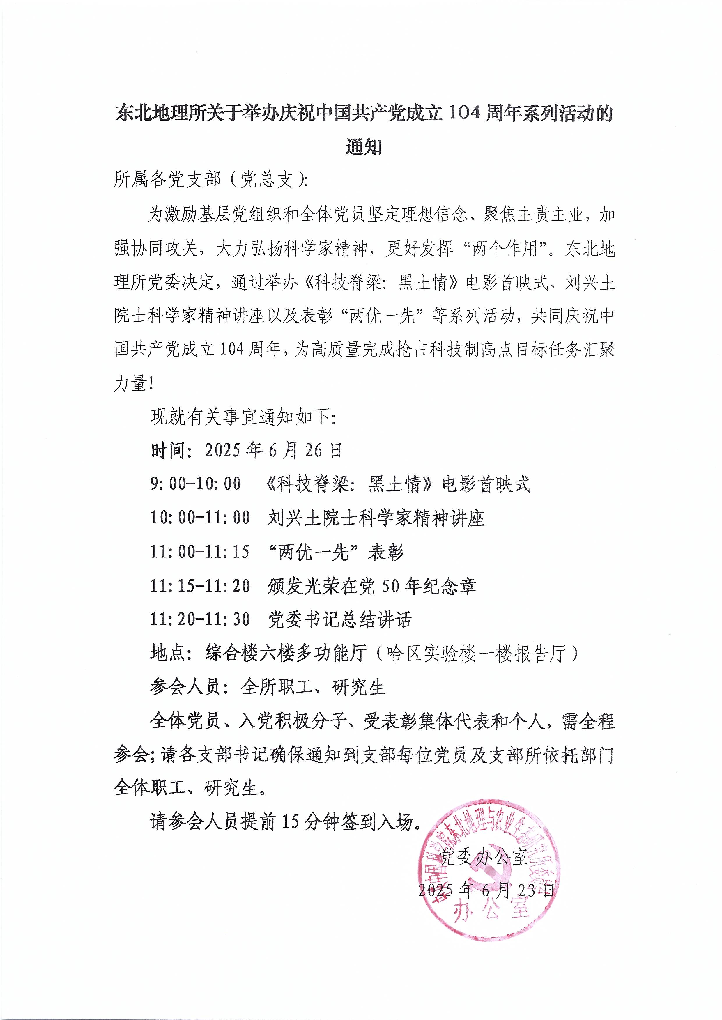 東北地理所關于舉辦慶祝中國共產黨成立104周年系列活動的通知