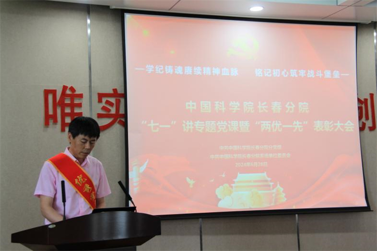 為深入學(xué)習(xí)貫徹習(xí)近平總書(shū)記關(guān)于黨紀(jì)學(xué)習(xí)教育的重要講話和重要指示精神,熱烈慶祝中國(guó)共產(chǎn)黨成立103周年,6月28日上午,中國(guó)科學(xué)院長(zhǎng)春分院隆重舉辦2024年度“七一”講專題黨課暨“兩優(yōu)一先”表彰大會(huì)。會(huì)上,中共中國(guó)科學(xué)院長(zhǎng)春分院分黨組、中共中國(guó)科學(xué)院長(zhǎng)春分院系統(tǒng)單位委員會(huì)對(duì)在長(zhǎng)春分院系統(tǒng)單位過(guò)去一年黨建工作中,表現(xiàn)突出的集體和個(gè)人給予表彰。
